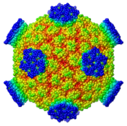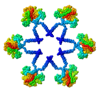 | Biological Unit 1 of a clathrin cage (3iyv) constructed from the crystallographic asymmetric unit and simplified to every second alpha carbon by FirstGlance in JSmol. Colored by distance from center. |